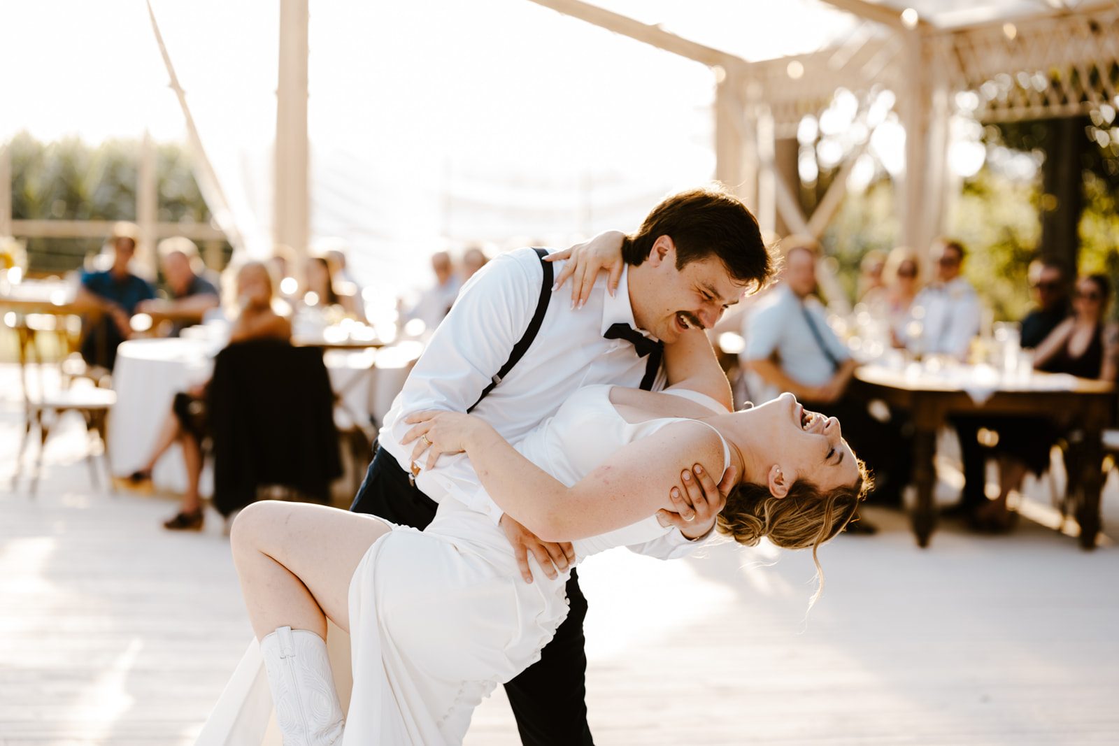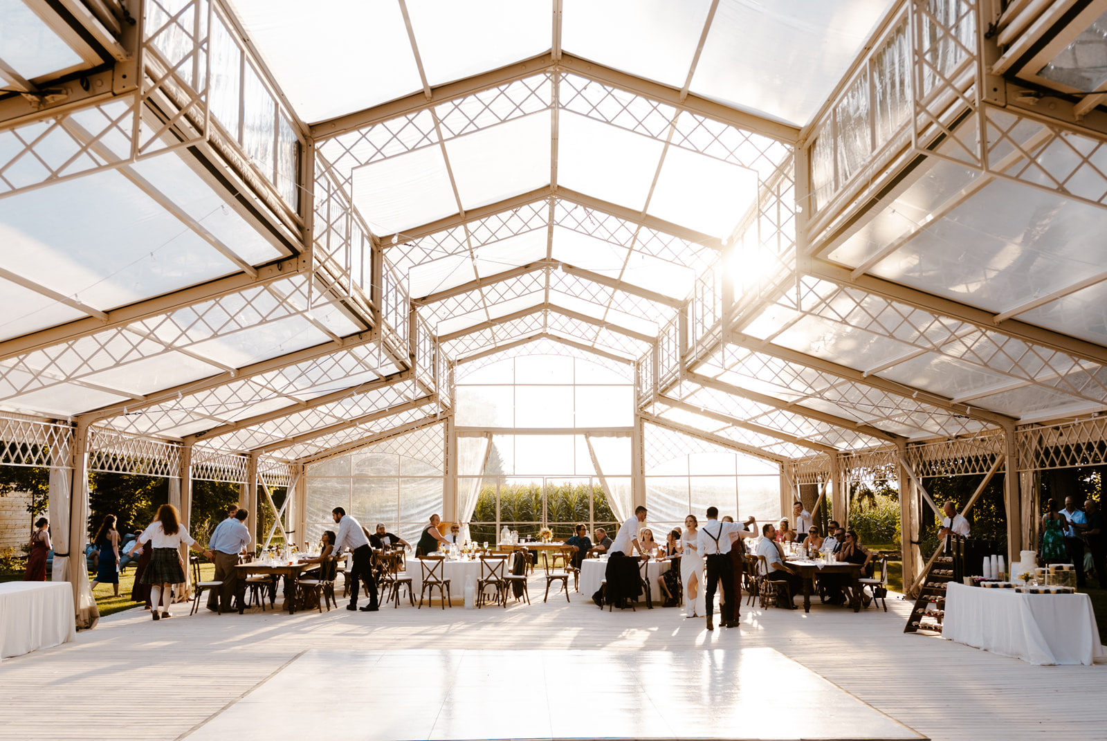 The reception unfolded beneath the estate’s stunning pavilion, where sweeping views of golden wheat fields framed the celebration. As the sun began to set, the entire venue was bathed in a warm glow — the perfect reflection of the couple’s simple, effortless love. From start to finish, their wedding was a seamless blend of natural beauty, heartfelt details, and pure happiness.